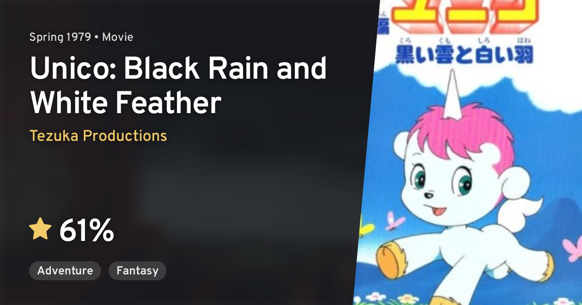 Just click the Edit page button at the bottom of the page or learn more in the Plot Summary submission guide. Kuroi kumo to shiroi hane. Release Dates 1 Also Known As AKA 2 Release Dates Japan 1979. It looks like we dont have any Plot Summaries for this title yet. 222 The Fantastic Adventures of Unico. Showing all 3 items Jump to. United States Unico Double Feature. With Hiroya Oka Kyoko Iwata Minori Matsushima Junpei Takiguchi. Black Cloud White Feather.