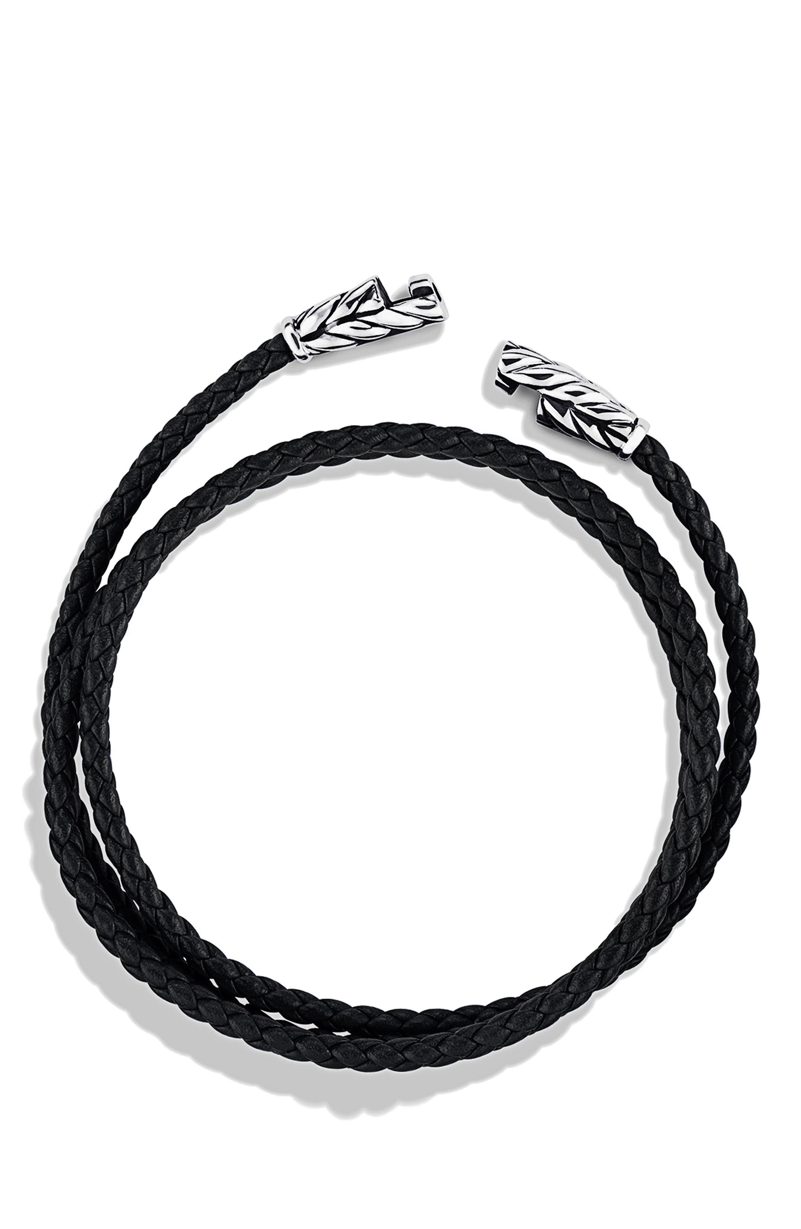 Chevron leather wrap bracelet. This chevron bracelet from David Yurman sports a triple-wrap woven black leather design with a chevron embossed sterling silver logo stamped magnetic clasp. ONE SIZE - The bracelet measures approximately 9MM in diameter after braiding. Genuine leather wrap bracelet with shiny silver chevron details and snap closure.